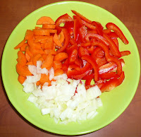 Am folosit ciuperci din conserva intrucat nu aveam atunci ciuperci proaspete, am folosit cam o cutie intreaga (aprox. 200 gr dupa ce le-am scurs). Ciupercile le-am lasat cum erau, doar cele maricele le-am taiat mai marunt. Legumele se spala cu apa din abundenta apoi se taie bucatele si se pun in tigaie la calit in foarte putin ulei apoi se condimenteaza.